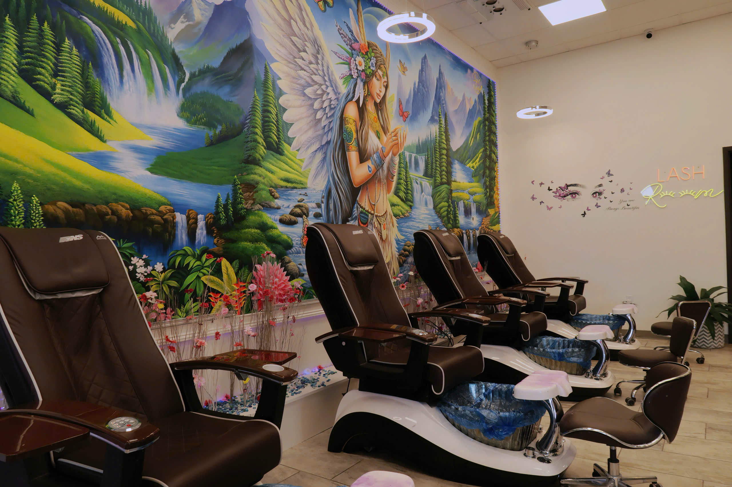 nail shaping, cuticle care, matcha scrub, collagen socks, massage, and hot towel.